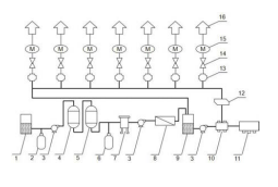 上     圖結(jié)構(gòu)示意圖中1為原水箱、2為聚合氯化鋁加藥裝置、3為增壓泵、4為多介質(zhì)過濾器、5為活性炭過濾器、6為阻垢劑加藥裝置、7為精密過濾器、8為膜分離裝置、9為凈水箱、10為消毒器、11為灌裝機(jī)、12為全自動(dòng)變頻控制器、13為儲(chǔ)水器、14為閥門、15為電機(jī)、16為用戶單元。